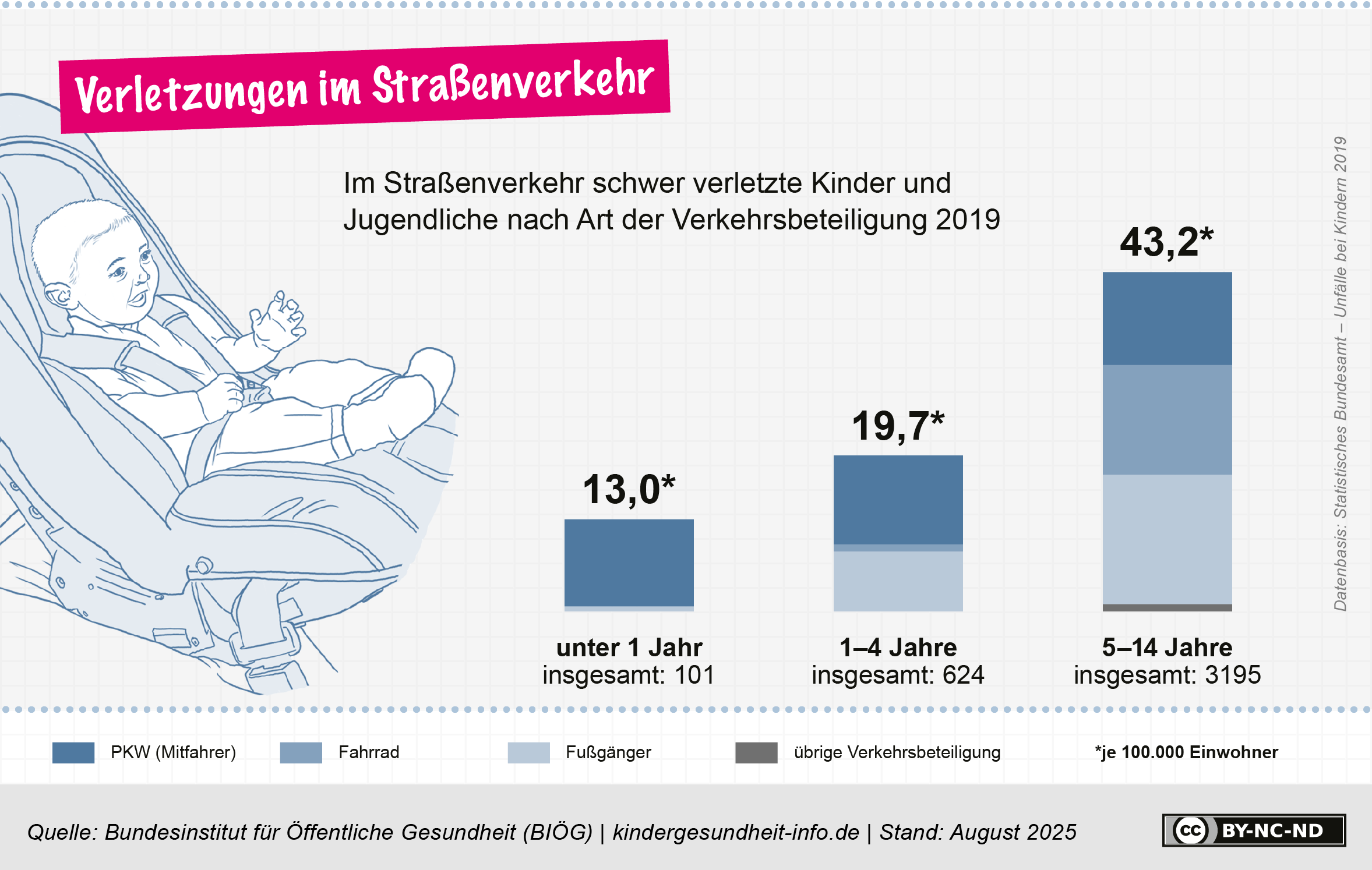 Babys und Kleinkinder verletzen sich im Straßenverkehr vor allem als Mitfahrer im Auto. Verletzungen nach Verkehrsbeteiligung. Infografik zum Ausdrucken.