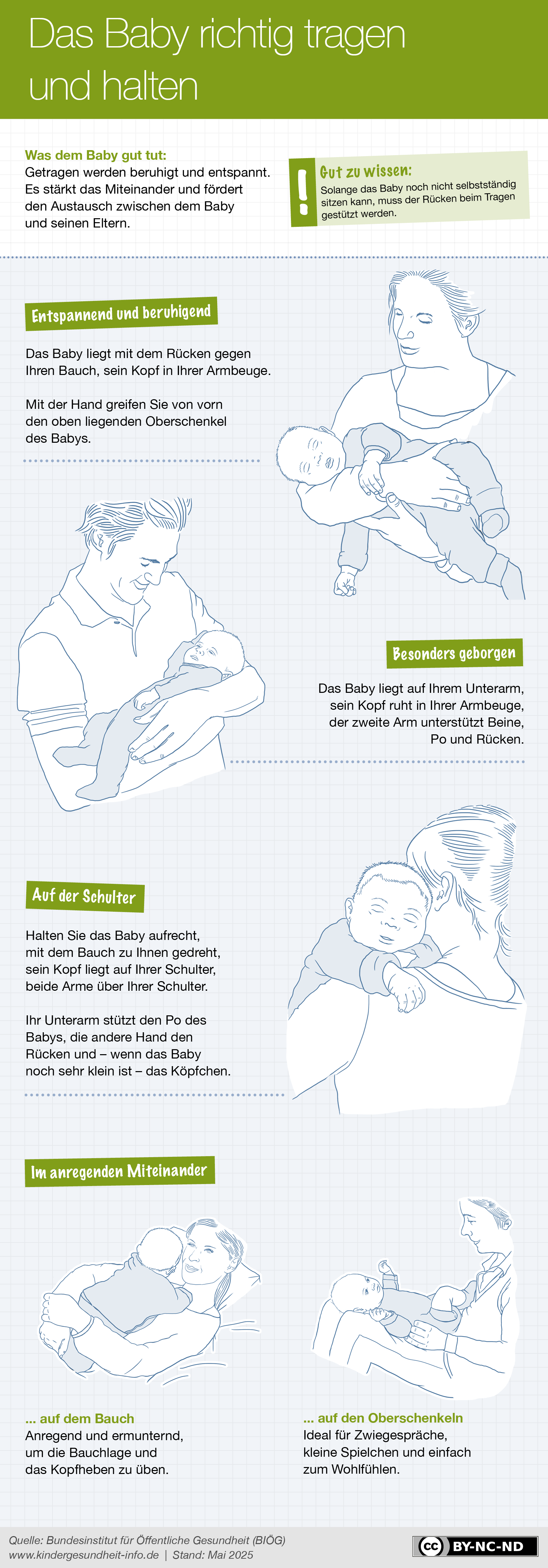 Wie Sie Ihr Baby richtig und sicher tragen und halten und dabei das Miteinander genießen. Anschauliche Infografik zum Ausdrucken.