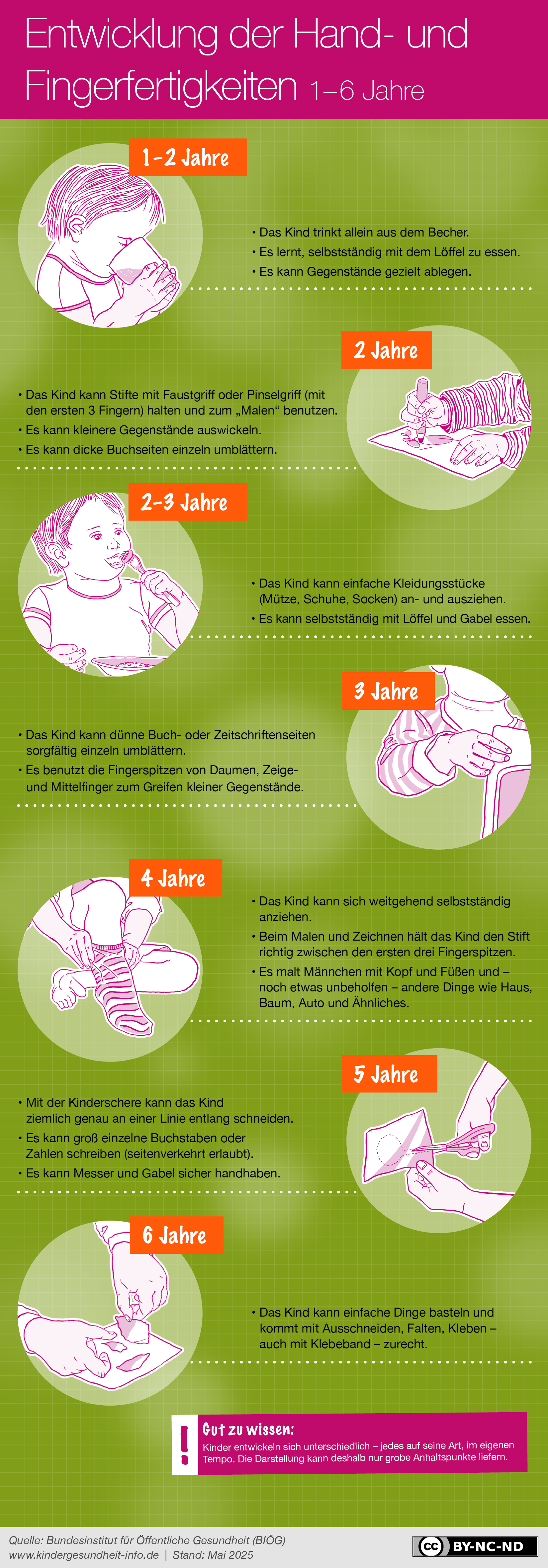 Wie entwickeln Kinder ihre Hand- und Fingerfertigkeiten? Die Infografik zum Ausdrucken zeigt wichtige Stufen der Entwicklung.