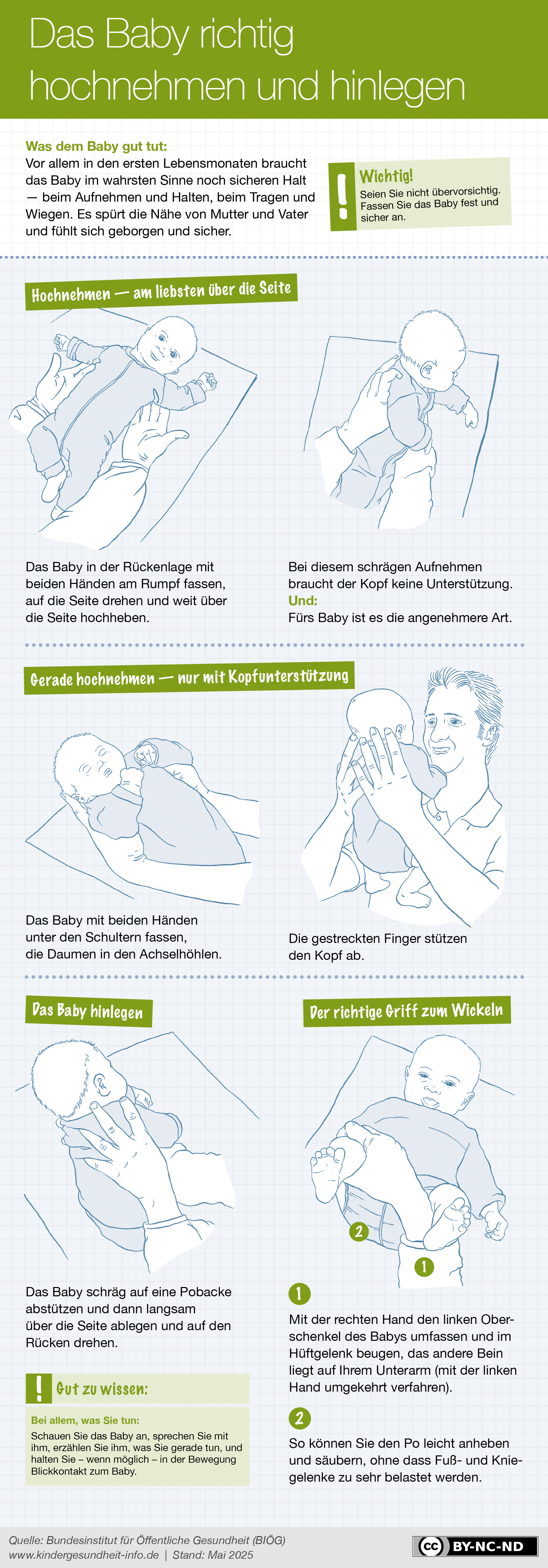 Wie Sie Ihr Baby richtig und sicher hochnehmen und wieder hinlegen - die wichtigsten Handgriffe zum Ausdrucken. Anschauliche Infografik zum Ausdrucken.