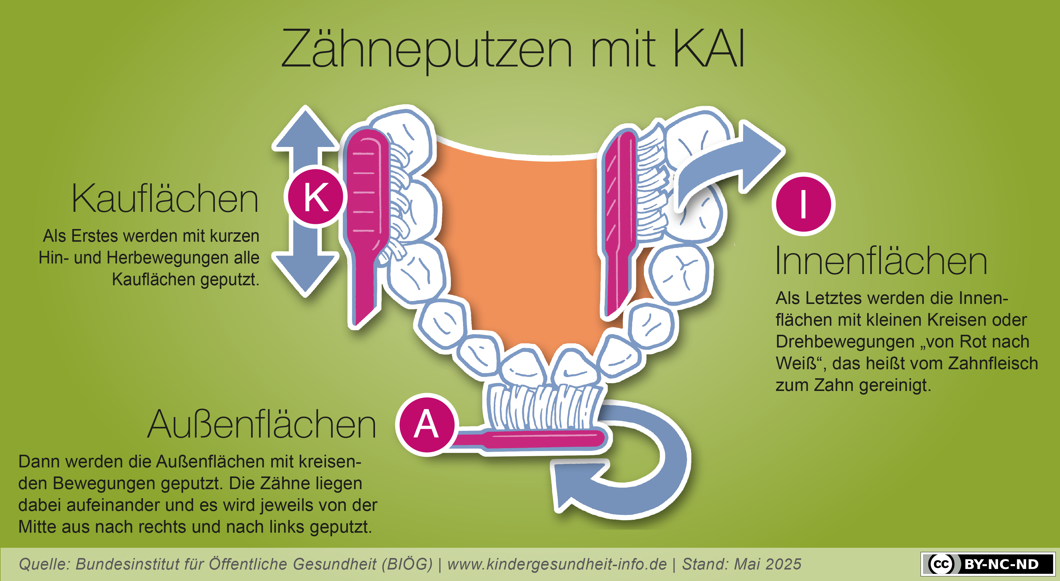 Richtiges Zähneputzen nach der KAI-Methode auch für Kleinkinder verständlich dargestellt.