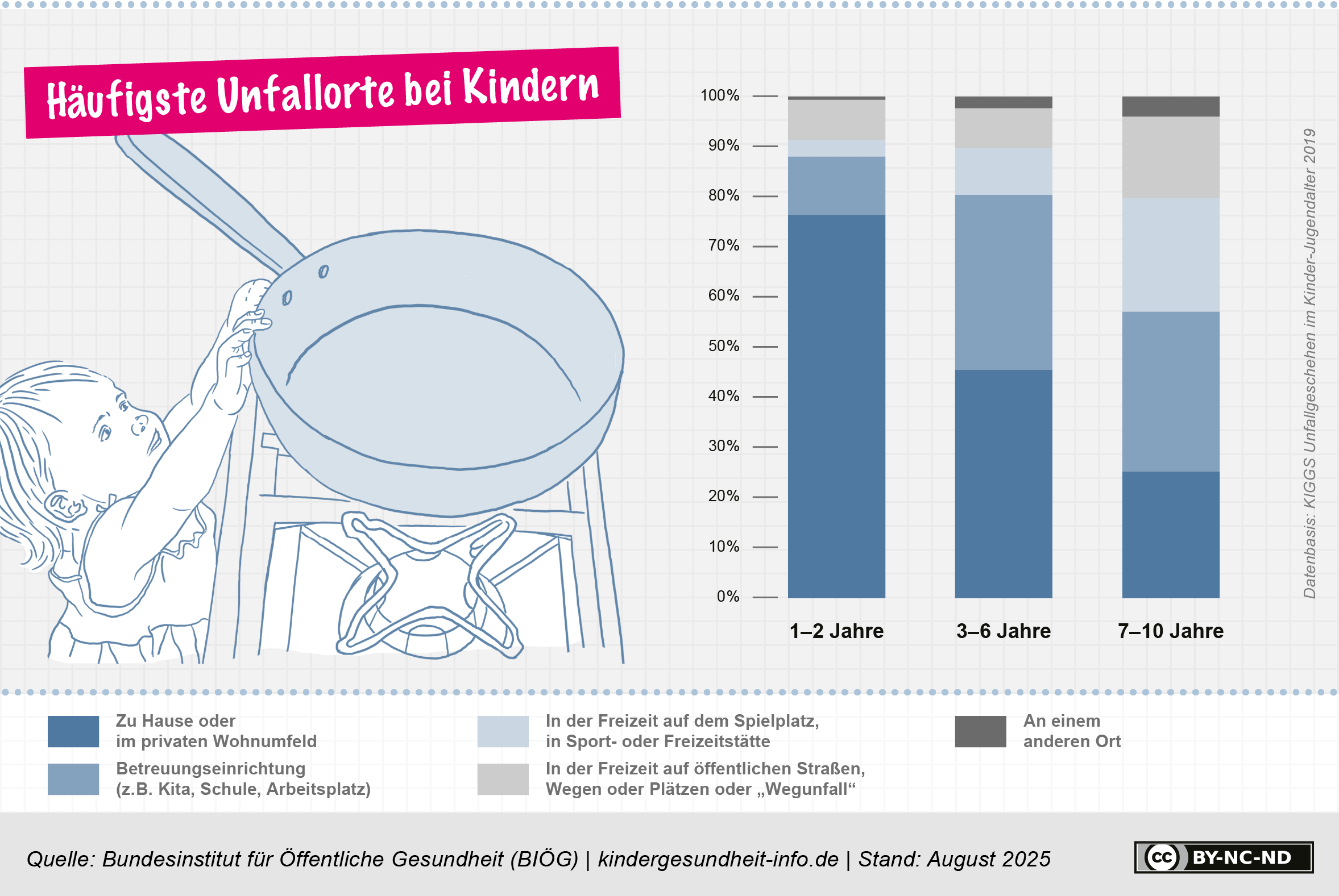 Babys und Kleinkinder verunglücken am häufigsten zu Hause. Darstellung, wie sich die Unfallorte mit dem Alter verändern, zum Ausdrucken.
