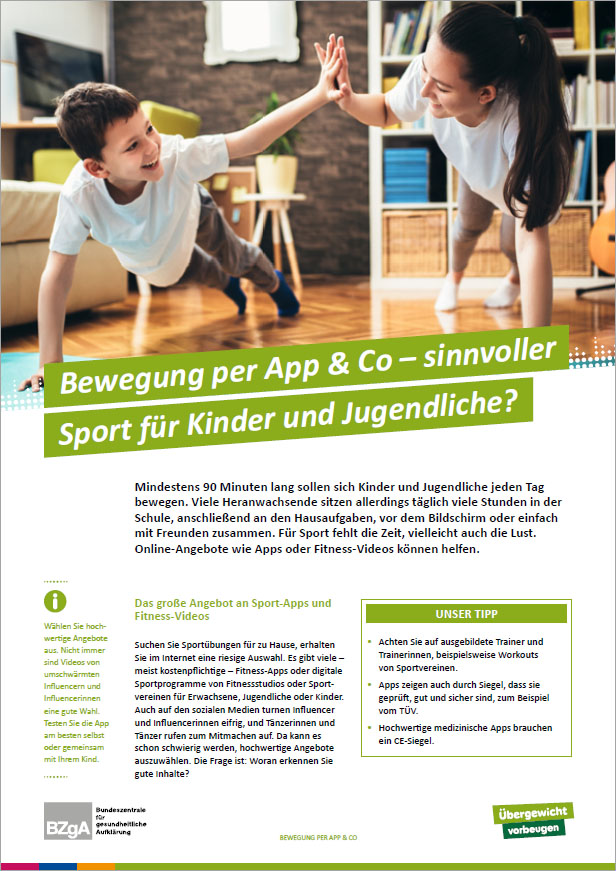 Es gibt Apps für Kinder, die spielerisch und unterhaltsam z. B. Wissen zur Ernährung vermitteln oder zu Bewegung motivieren. Sie können helfen, Verhalten zu ändern. Seien Sie offen für die neuen Möglichkeiten. Gesundheits-Apps sind sehr unterschiedlich, wie sinnvoll sie sind, lässt sich pauschal nicht beurteilen.