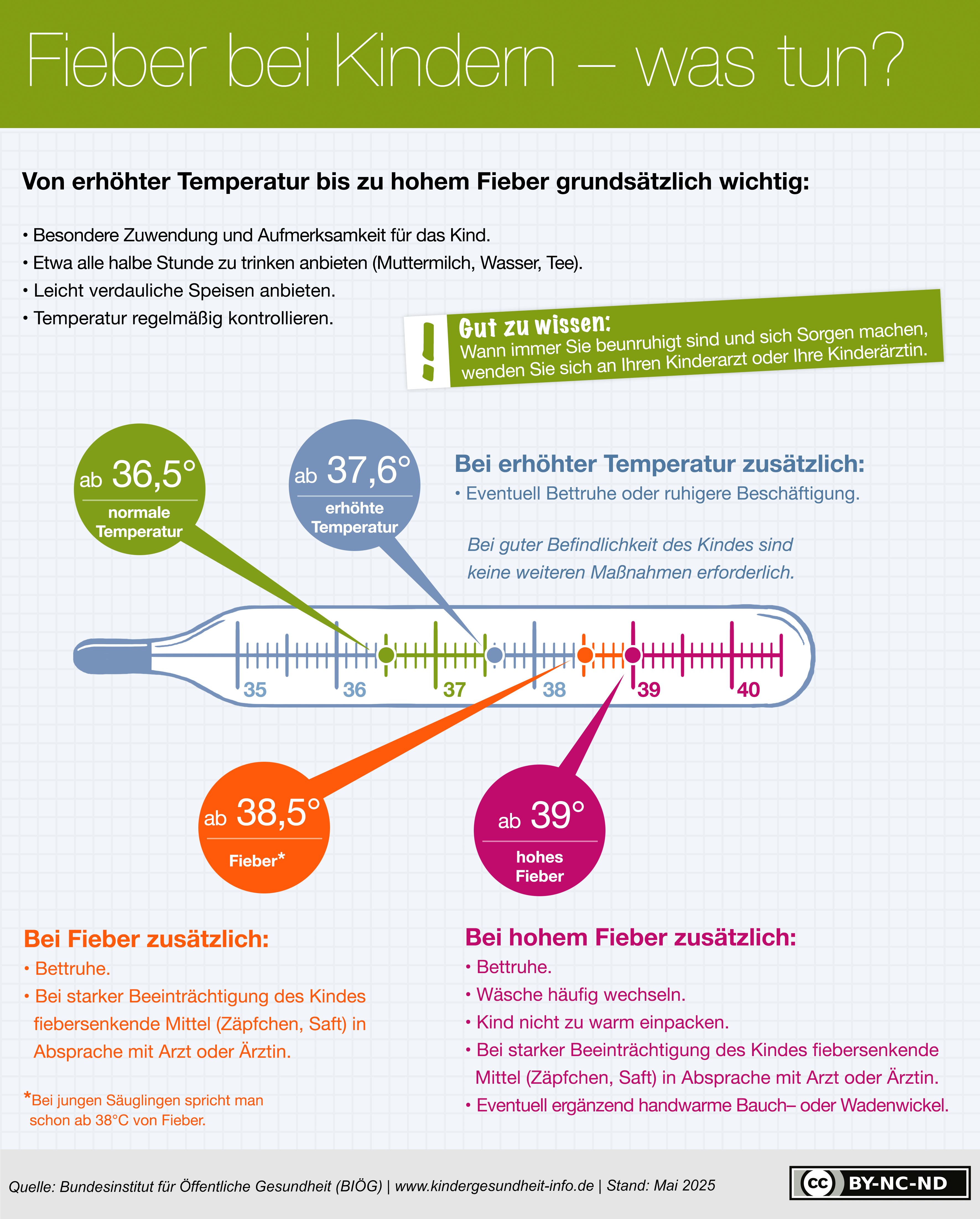 Die Infografik zeigt auf einen Blick, ab wann bei Baby und Kind erhöhte Temperatur, Fieber und hohes Fieber vorliegt.
